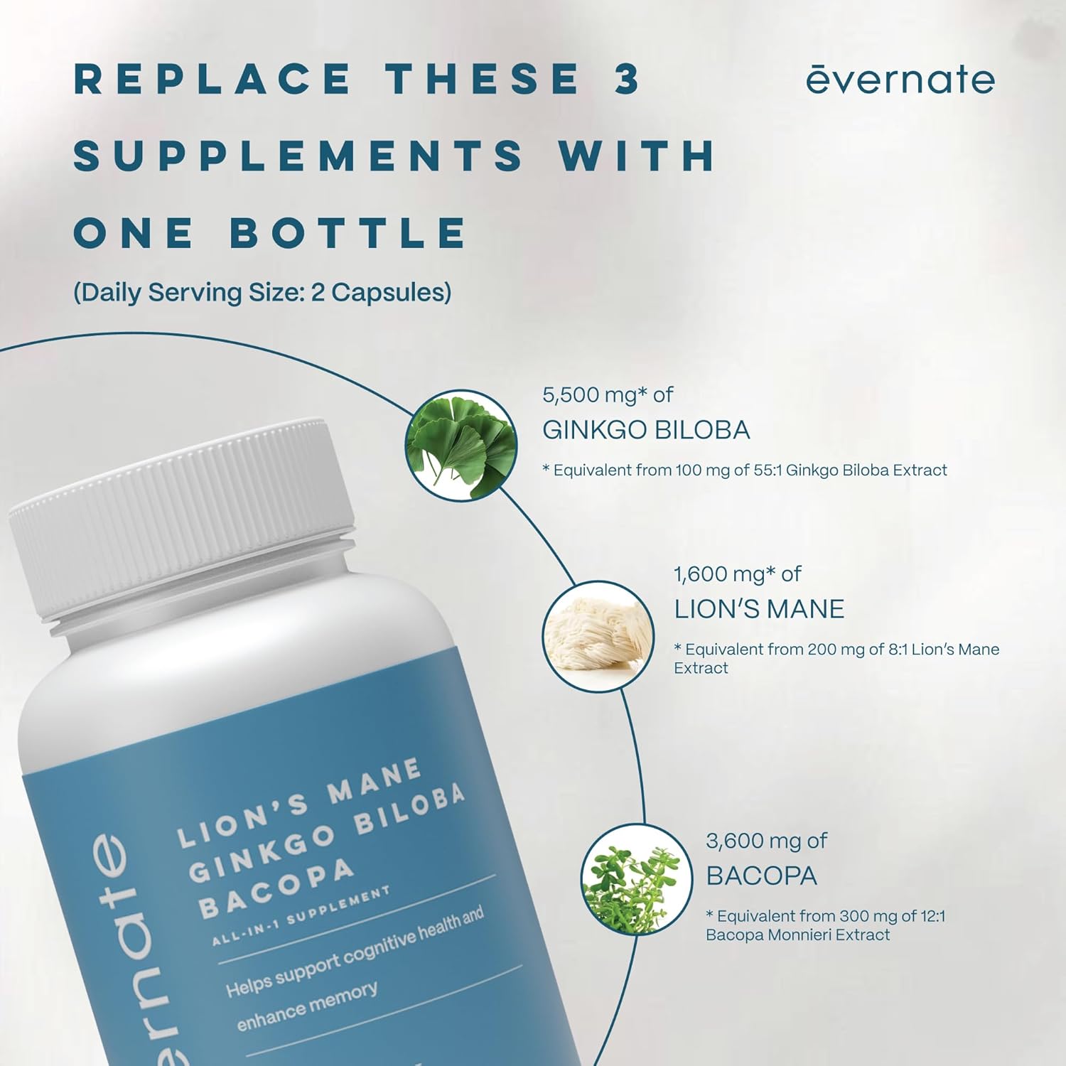 ALL-IN-ONE BRAIN SUPPORT FORMULA Evernate combines the powerful benefits of Lion’s Mane, Ginkgo Biloba, and Bacopa Monnieri in a single supplement to support memory, focus, and cognitive performance—perfect for those seeking an all-in-one brain health solution.