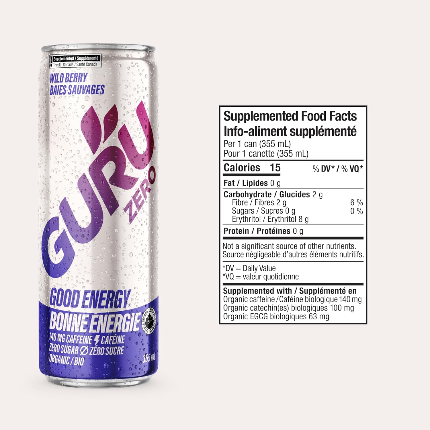 GURU ZERO SUGAR Wild Berry Organic Energy Drink with Plant Based Natural Caffeine from Green Tea, Coconut Water, Zero Added Sugar, 140mg Caffeine, Healthy Drinks, 355mL (Pack of 24).