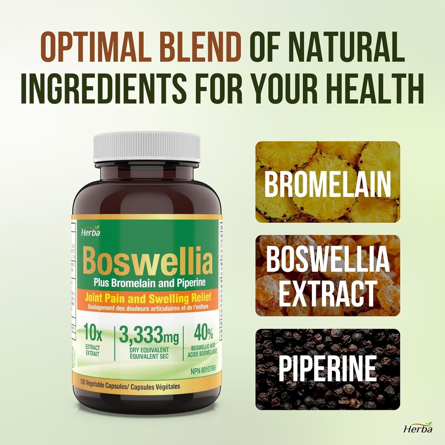 Herba Boswellia Serrata Capsules with Bromelain Supplement – 120 Capsules | 3,330mg – 10:1 Boswellia Supplement with Black Pepper – Extra Strength | Relieves Joint Pain and Swelling | Made in Canada