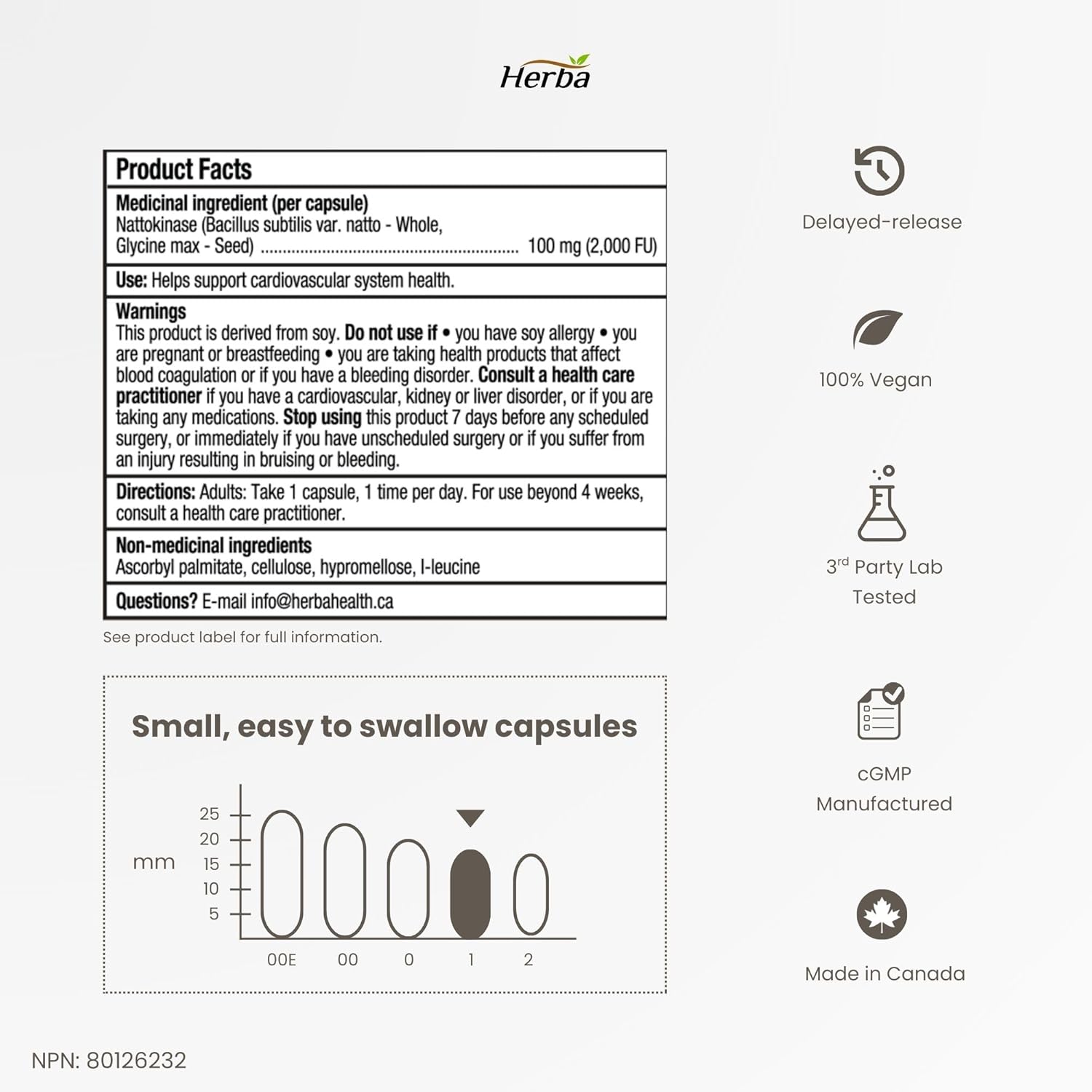 Herba Nattokinase Supplement 2000 FU – 100mg, 120 Delayed Release Capsules | Helps to Support Heart Health | Made in Canada