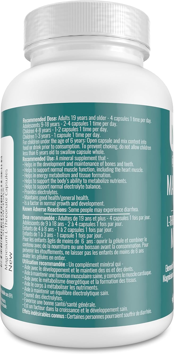 Helps in the development and maintenance of bones and teeth.Helps to support normal muscle function, including the heart muscle.Helps in energy metabolism and tissue formation.Helps to support the body’s ability to metabolize nutrients.Helps to support normal electrolyte balance.Provides electrolytes.Maintains good health/general health.Is a factor in normal growth and development.The Numbers: 50 mg Elemental Magnesium per Capsule (from 695 mg Magnesium L-Threonate) – 200 mg Once-Daily Adult Serving – 124 Capsules per Bottle – 31 to 124 Servings – 1 to 4-Month Supply – 0 Added Ingredients – 100 Percent Pure – Product License 80129527