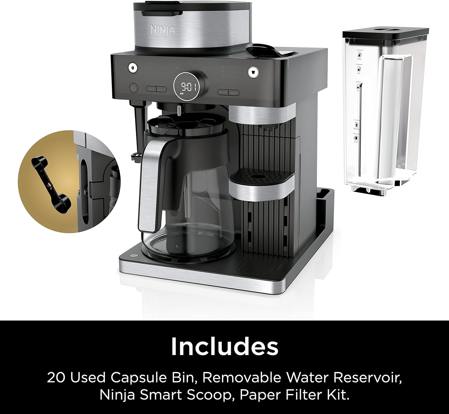 INCLUDES: 20 Used Capsule Storage Bin, Removable Water Reservoir, Ninja Smart Scoop, Warming Plate, Paper Filter Kit, 12-Cup Glass Carafe. Espresso capsules are sold separately.Customers say