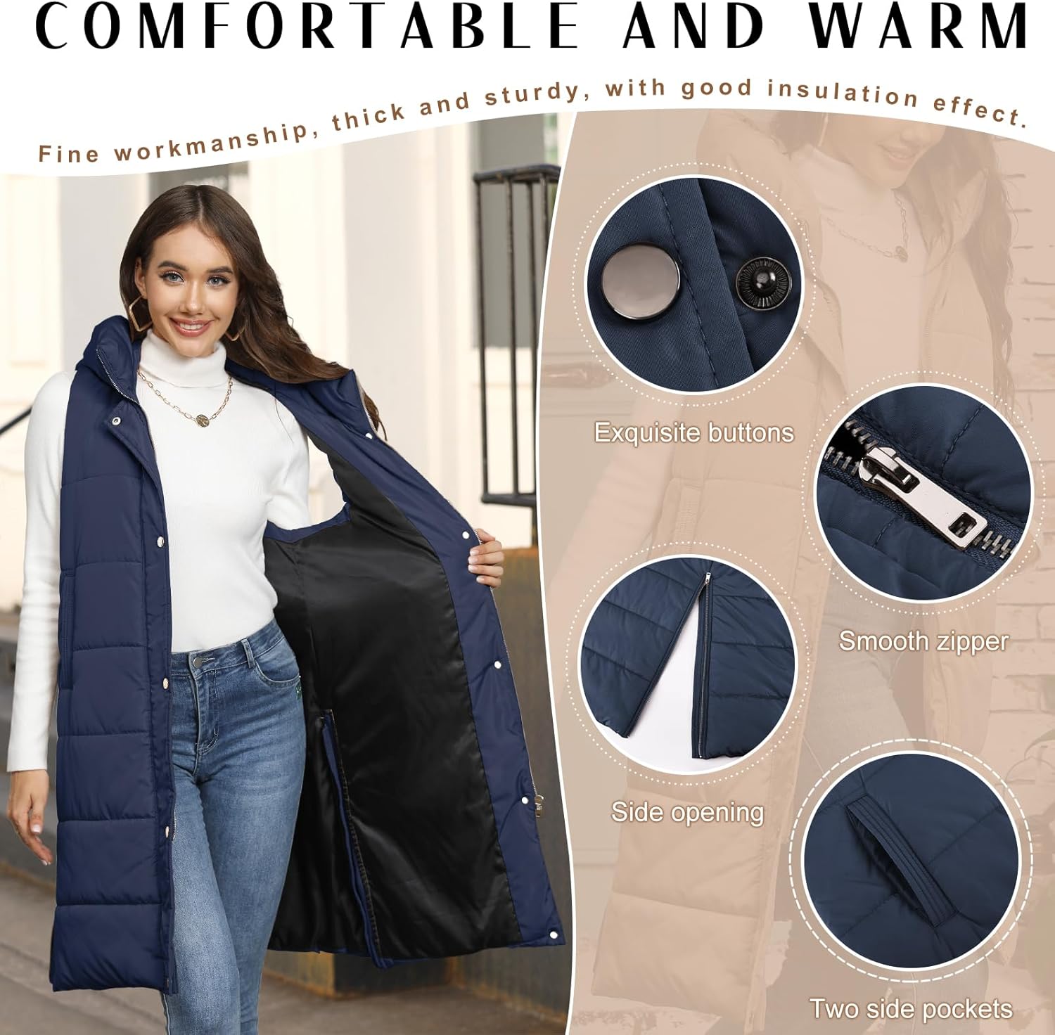 Puffer Vest for Women Long Vest Hooded Sleeveless Vests Outerwear Down Jacket Quilted Full-Zip Winter Coat Outdoor