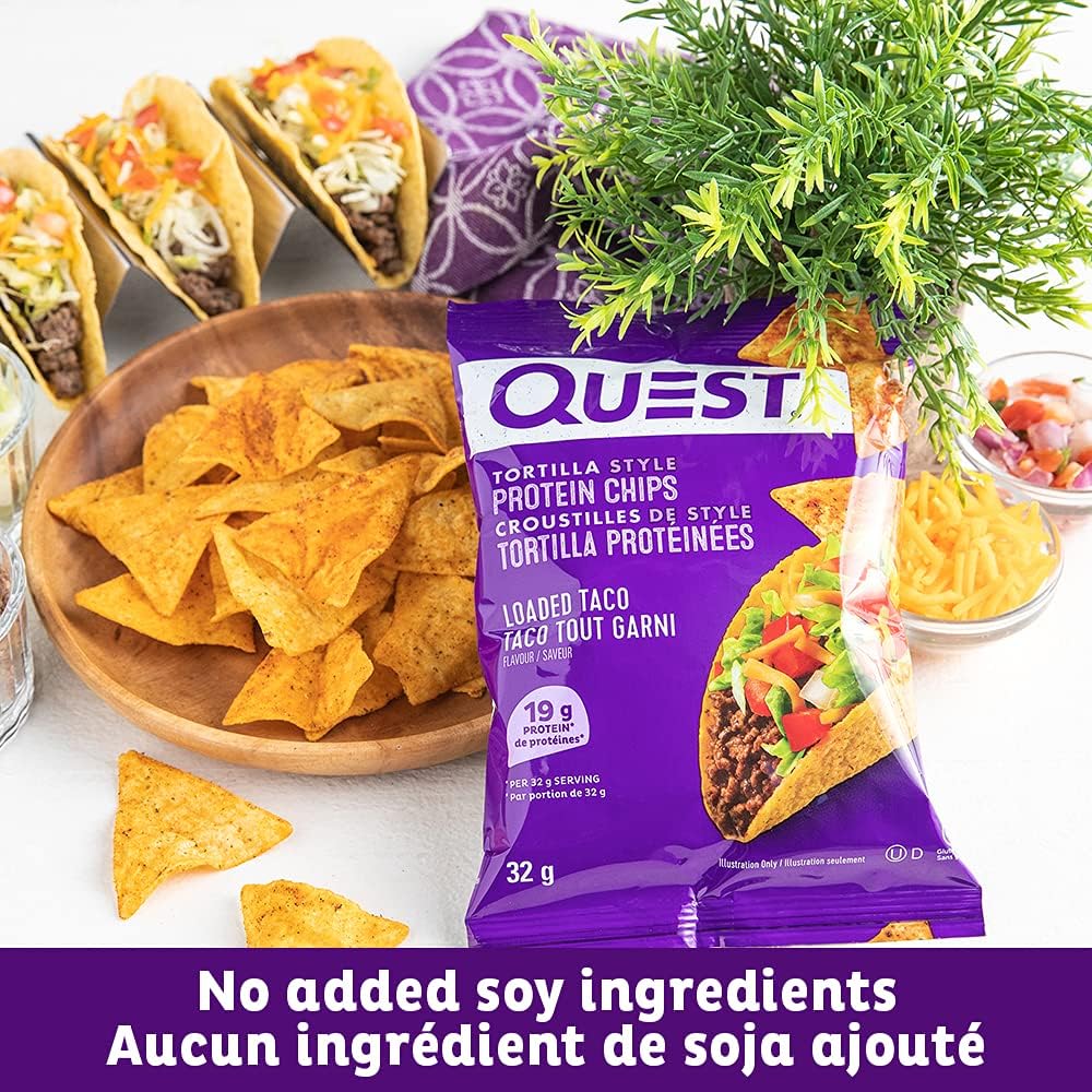 Enjoy more. Carb less: the quest loaded Taco tortilla style protein chips provide all the crunch and satisfying taste of a regular tortilla chip. Only ours have 19g of protein per bag
