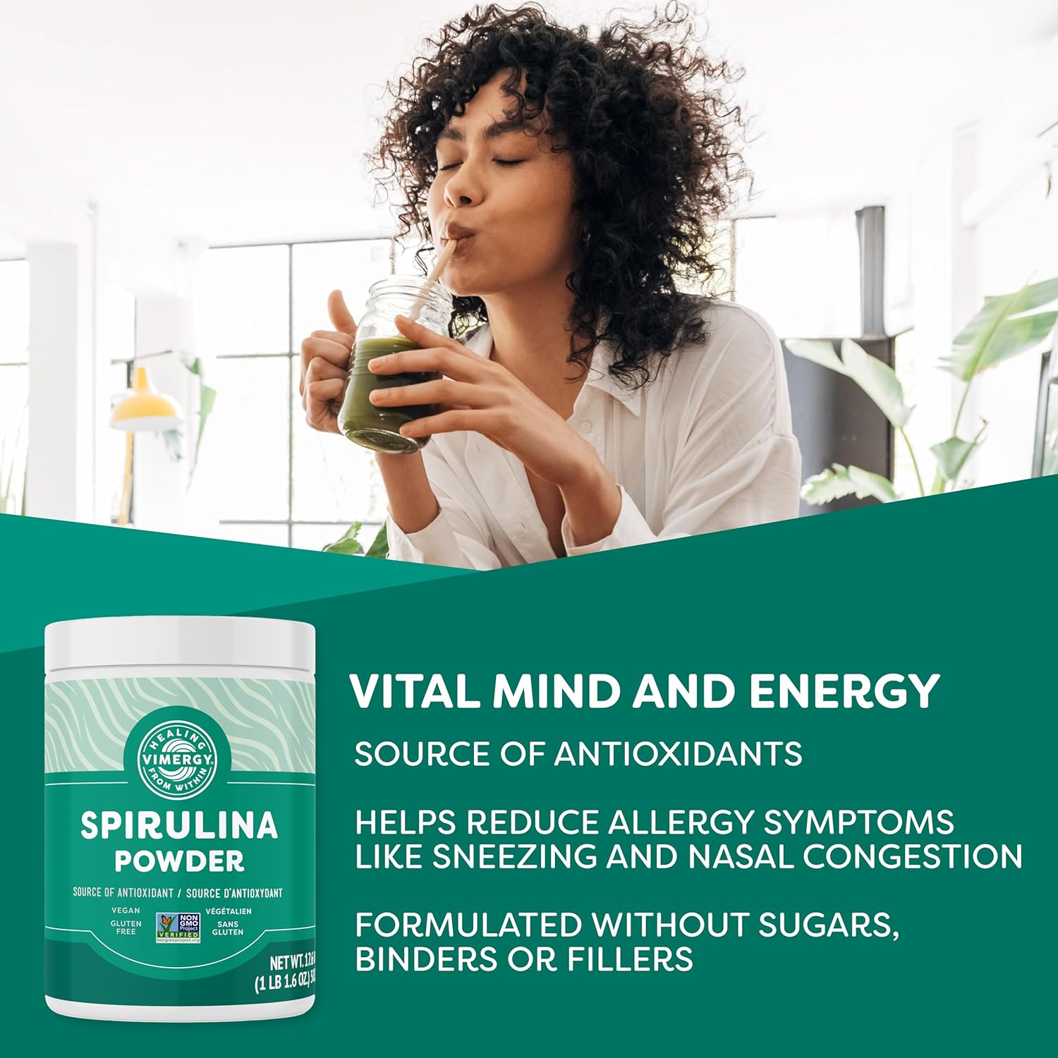 PEACE OF MIND CLEAN VIMERGY spirulina super greens powder is formulated without anti-caking agents, fillers, binders, sugar, colors, or flavors. VIMERGY Spirulina Powder is non-GMO, vegan, kosher and paleo friendly. For a daily health boost, just add a scoop of our natural green powder to a glass of water or juice, or a smoothie.Customers say